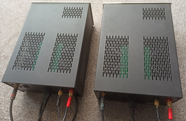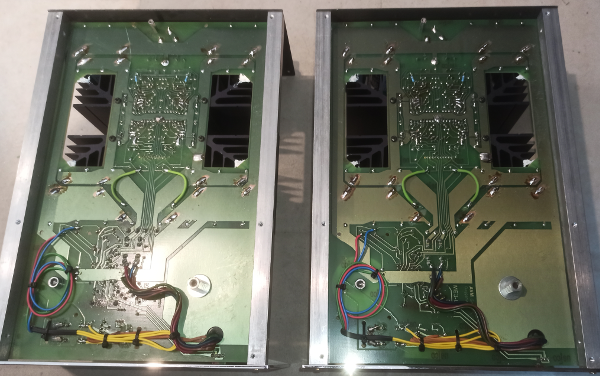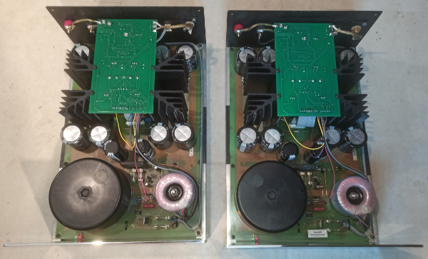 zum Zu-Ende-Entwickeln des Boards habe ich mir erst mal einen Monoblock aus Resten zusammengestellt, der steht jetzt noch ziemlich verwaist OHNE Steuerboard da, denn ich hatte zunächst nur zwei dieser Boards. Von einem Kollegen konnte ich dann ein Paar M1 zweiter Generation kaufen und herrichten, die ließen sich mit den Erfahrungen aus dem Einzelmuster auch funktionstüchtig fertig stellen. Somit habe ich ein Paar zur Ansicht. Und zum Verleih. Zu verkaufen wird es erst sein, wenn ich fremd-gefertigte Platinen zur Verfügung habe, unter Umständen dann auch mit Serien-Boards.