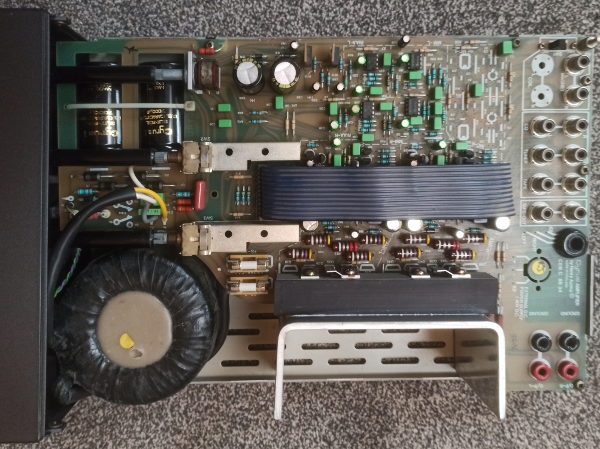 Die Endstufe ist durchgehend konventionell mit bipolaren Transistoren aufgebaut. Sie zählt durchaus zu den minimalistisch Konzepten mit niedrigen Verzerrungs-Werten. Ein- wie Ausgang sind ungewöhnlich aufgebaut, die Eingangs-Transistoren sind als Sziklai-Paare ausgeführt, und weisen (wie z.B. auch der Musical Fidelity B1) entsprechend eine hohe Vergleicher-Empfindlichkeit auf. Die Endstufen wurden mit Transistoren aus dem Schalt-Bereich auf Puls-Festigkeit und geringe Schalt-Effekte ausgelegt, die Wahl fiel auf BUV28/BUV48 - die man hier als die OEM-Typen PT17/PT77 findet. Hierzu gibt es allerdings keine Komplementär-Typen, so dass man auf eine Quasi-Komplementär-Schaltung mit lauter gleichen End-Transistoren ausgewichen ist.