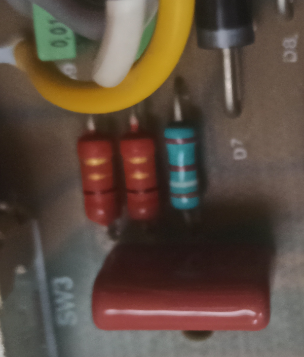 Nachgerüstetes Pi-Filter aus 1-Ohm-Widerständen und Entstör-Kondensator des Phono-Netzteils. Diese Maßnahme ist ein verbesserter Ersatz für Snubber-Kondensatoren und begrenzt auch die Ladeströme und deren Störfelder.