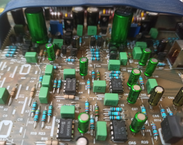 - Alle kleinen polaren 85°C Elektrolytkondensatoren werden gegen Panasonic FM 105°C, bipolare Elkos gegen neue bipolare 85°C Nichicon Muse Elkos erneuert, die Tiefpass-Filter-Kondensatoren der Überstrom-Abschaltung werden durch dauer-stabile Wima-Folienkondensatoren ersetzt.
