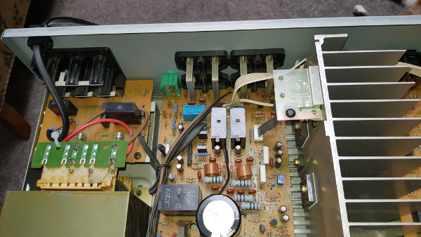 Endstufe mit den "MOSFET-Drive"-Platinen oben am Kühlkörper, im Hintergrund das Netzteil, links vorne, unten sieht man den Fernbedien-Motor des Potentiometers.