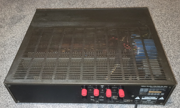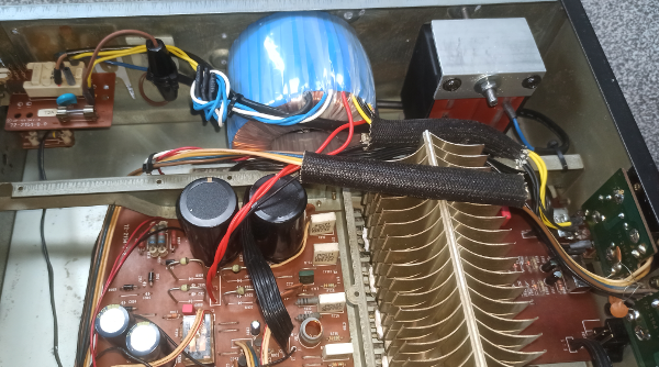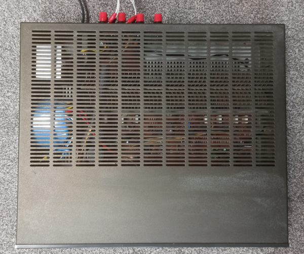 Die Endstufe war mal 2011 unbesehen in Ebay eingekauft worden für 50€ defekt. Mein einer neuer Kollege arbeitet das gesamte Jahr schon diese Alt-Bestände für den Verkauf auf. Und irgendwann ist auch diese Endstufe auf den Tisch gekommen - wir machen immer allen Verschleiß vorab raus, um uns nicht hinterher unnötig den Kopf zu zerbrechen, woher die Probleme kommen - es ist überwiegend einfacher ERST Lötstellen, Schalter, Regler zu überarbeiten, Elektrolytkondensatoren und Trimmer zu erneuern, als um sie herum aufwändig Fehlersuche zu betreiben und dabei zu merken, dass alles am Verschleiß lag, den wir ja sowieso nicht drin lassen wollen. Bei weit verschlissenen Geräten jenseits der 20 Jahre Alter/Nutzung ist das in der Regel einfach weit billiger, so vorzugehen. Es ist auch weitaus schonender und sicherer für ein Gerät, wenn all das im Vorfeld erledigt ist. Denn dann ist das Risiko, beim ersten Einschalten in Rauch aufzugehen, einem mit einem "Peng" um die Ohren zu fliegen, deutlich reduziert. Wir schalten NIE unvorsichtig und eilig einfach was ein, schon gar nicht ohne Brems-Maßnahmen an der gewöhnlichen Netz-Steckdose. Das ist überwiegend viel gefährlicher und im Vergleich zum ersten Einschalten NACH Vorarbeiten eher selten ziel-führend.