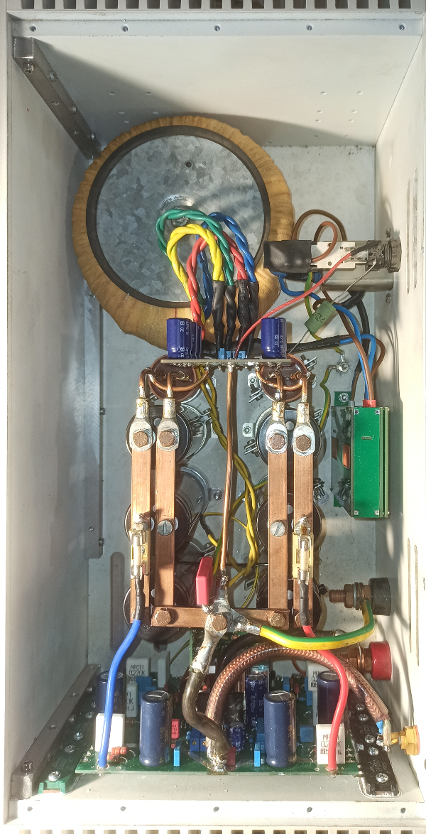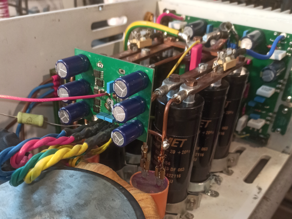 Die neue Elko-Bestückung ist phantastisch, hätte das früher nicht gedacht, welche Qualität die Long-Life-85°-Becher mit Schraubanschluss von BHC haben. Wir reden hier von je 22 Milliohm ESR (also 7 Milliohm bei je drei pro Spannung), je 16,4A Brummstrom (also fast 50A Ladestrom möglich), klanglich extrem ausgeglichen.