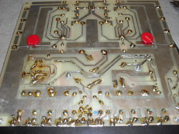 Die sind mit dem Alter fertig, ich mag sie (oder was davon noch übrig ist) klanglich ohnehin nicht sonderlich. Bei F&T konnte ich noch einen Satz passender, hochwertiger Exemplare beschaffen, der Rest wurde mit billigerer 105°C Massen-Ware ersetzt, nicht allzu schlecht, aber auch nicht das Ende der Fahnenstange. Immerhin egalisiert die sternförmige Masseführung einige Elko-Probleme. Überrascht hat mich der Unterschied zwischen den beiden Onestas, einer hatte auf vergoldete Miniatur-Kontakte gesteckte Spannungs-Verstärker-Module, beim anderen waren Drähte durch entsprechende Löcher gezogen und umgeknickt verlötet worden. Bei dem zweiten Exemplar hatte man auch einige Massepunkte an der Platinen-Rückseite mit durchgehenden Kabeln vom Haupt-Sternpunkt an der jeweiligen Lautsprecher-Minus-Klemme direkt verlötet - nachdem sie kompliziert durch Lücken gefädelt worden waren. Ich habe da zuerst die vorgesehenen Klemmen wieder eingebaut, doch zeigte sich dabei im ersten Hörtest ein deutliches Brummen, das erst verschwand, nachdem ich (dann bei allen vier Endstufen-Modulen) die entsprechenden dünnen Leiterbahnen mit versilbertem Kupferdraht auf ein Vielfaches verstärkt hatte.