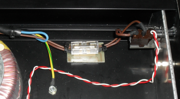 So kam z.B. zur vorhandenen Isolierung durch ein Stück unter gelegte Platine noch eine Netzsicherungs-Abdeckung. Die Netzkabel-Führung innen wurde zwecks Entstörung noch mit Hilfe von Kabelbindern parallelisiert.