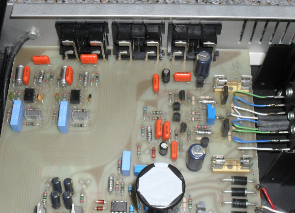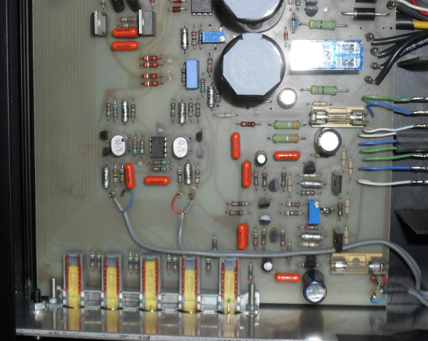 Aus den Messwerten aller vier Endstufen der beiden Geräte wurde ein Ruhestrom von vermutlich 50mA (ca. 3,1W Ruheleitung pro Kanal) ermittelt und mit neuen Bourns-25x-Trimmern wieder eingestellt. Alle Elkos wurden frisch gemacht, die Bedienelemente gereinigt und versiegelt, mögliche Sicherheits-Fragen auch noch im Detail verbessert.